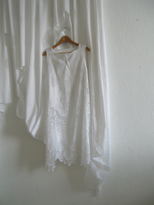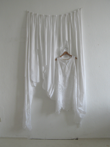 dress-1/11 2011 lace curtain, thread, dress hanger 94.881x45.275x5.905 inch
